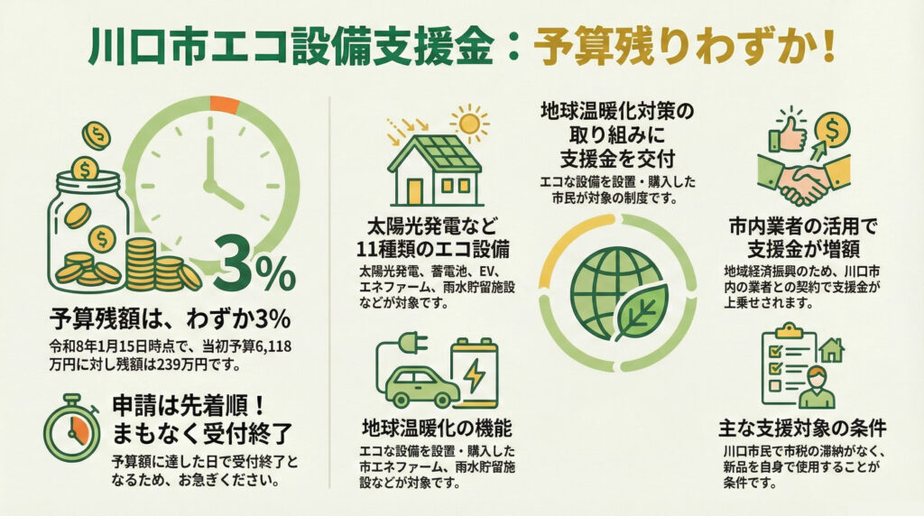 ※本記事の情報は令和8年1月15日時点の制度内容に基づいています。最新の予算残額や詳細については、川口市環境総務課または当社へお問い合わせください。